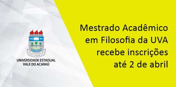 A Coordenadoria do Mestrado Acadêmico em Filosofia da Universidade Estadual Vale do Acaraú (MAF/UVA) iniciou o processo seletivo de candidatos à segunda turma do curso, com inscrições até o dia 2 de abril de 2020. De acordo com o Edital nº01/2020, publicado em 10 de fevereiro, são ofertadas 12 (doze) vagas para ampla concorrência, distribuídas em duas linhas de pesquisa, cada uma com seis vagas: 1) Filosofia da Religião e Filosofia Política; e 2) Ontologia, Conhecimento e Linguagem. As inscrições devem ser feitas, exclusivamente pela Internet.