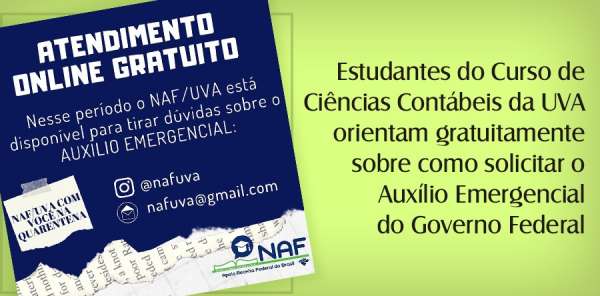O Núcleo de Apoio Contábil e Fiscal da Universidade Estadual Vale do Acaraú (NAF/UVA) está fazendo o atendimento gratuito com orientação sobre como solicitar o Auxílio Emergencial de R$600, a ser pago pelo do Governo Federal. As orientações estão sendo feitas, também, sobre o Imposto de Renda Pessoa Física. O serviço está sendo prestado por e-mail (nafuva@gmail.com) e pelo Instagram (@nafuva).
