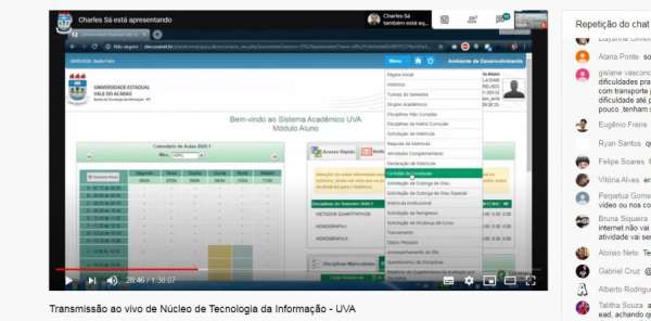 A capacitação dos estudantes de graduação da UVA sobre uso das novas ferramentas do Sistema Acadêmico para realização de atividades não presenciais foi realizada, por meio de uma live, pelo Núcleo de Tecnologia da Informação (NTI/UVA), em 08/05/2020.