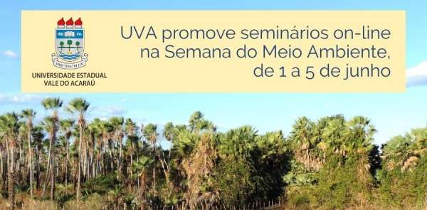 Na semana em que é comemorado o Dia Mundial do Meio Ambiente (5 de junho), o Curso de Ciências Biológicas da Universidade Estadual Vale do Acaraú (UVA) promove, no período de 1º a 5 de junho de 2020, um Ciclo de Webinários sobre Meio Ambiente da UVA. Com início sempre às 14h30min, as transmissões serão feitas pela plataforma Google Meet.