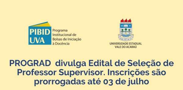 A Pró-Reitoria de Ensino de Graduação da Universidade Estadual Vale do Acaraú (PROGRAD/UVA) prorrogou, até o dia 3 de julho de 2020, as inscrições de interessados em participar do Processo Seletivo Simplificado do Programa Institucional de Bolsa de Iniciação à Docência (PIBID/UVA), na modalidade de Professor Supervisor. As inscrições, iniciadas em 17 de junho de 2020, devem ser feitas pelo e-mail indicado no Edital nº03/2020.