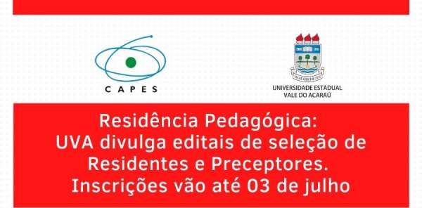 A Pró-Reitoria de Ensino de Graduação da Universidade Estadual Vale do Acaraú (PROGRAD/UVA) prorrogou, até o dia 3 de julho de 2020, as inscrições de candidatos nas modalidades Residentes e Preceptores do Programa Institucional de Residência Pedagógica (PRP/UVA). As inscrições dos candidatos deverão ser feitas com o envio da documentação indicada nos Editais, para o e-mail residencia_pedagogica@uvanet.br.