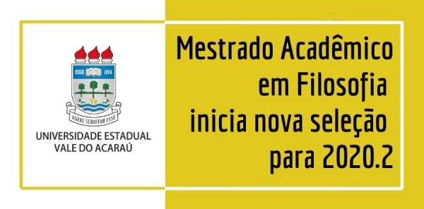 A Coordenadoria do Mestrado Acadêmico em Filosofia da Universidade Estadual Vale do Acaraú (MAF/UVA) iniciou novo processo seletivo de candidatos à segunda turma do curso, com inscrições até o dia 16 de agosto de 2020. O novo Edital substitui o anterior, publicado em 07 de fevereiro deste ano, que foi revogado considerando o período de isolamento social e restrições legais, em virtude da pandemia do novo Coronavírus (COVID-19), que impossibilitaram a realização de etapas presenciais do processo seletivo.