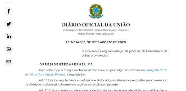 Neste 19 de agosto, data em que se comemora o Dia do Historiador, os profissionais desta área comemoram, também, uma conquista especial. Foi publicada no Diário Oficial da União, nesta terça-feira, 18 de agosto de 2020, a Lei 14.038/2020, que regulamenta a profissão de Historiador em nosso País. A Lei estabelece os requisitos para o exercício da atividade profissional e determina o registro em órgão competente. O projeto que deu origem à Lei (PL 4699/12) havia sido integralmente vetado pelo presidente Jair Bolsonaro, com o argumento de que a regulamentação “restringia o livre exercício profissional”. O veto foi derrubado pelo Congresso em votação ocorrida na quarta-feira, 12 de agosto.