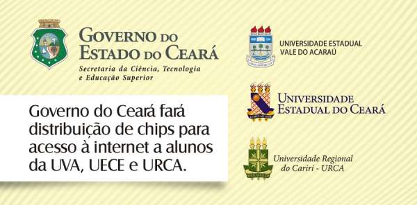 Com o objetivo de propiciar suporte aos alunos para participarem de aulas e atividades remotas, em decorrência da pandemia do novo coronavírus (COVID-19), o Governo do Ceará está destinando a estudantes das três universidades estaduais públicas (UVA, UECE e URCA), em caráter excepcional, chips de dados de Internet móvel (SIM card). Os chips serão doados a estudantes regularmente matriculados.