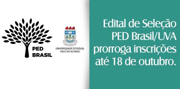 A Pró-Reitoria de Educação Continuada da Universidade Estadual Vale de Acaraú (PROED/UVA) informa que foi prorrogado, até o dia 18 de outubro de 2020, o período de inscrições de candidatos à seleção de professores para o Programa de Especialização Docente (PED Brasil/UVA). O novo cronograma de atividades do Processo Seletivo será divulgado em breve. Todas as normas de seleção, exceto os prazos, permanecem inalteradas e estão disponíveis no Edital nº001/2020 – PROED/UVA-SME.