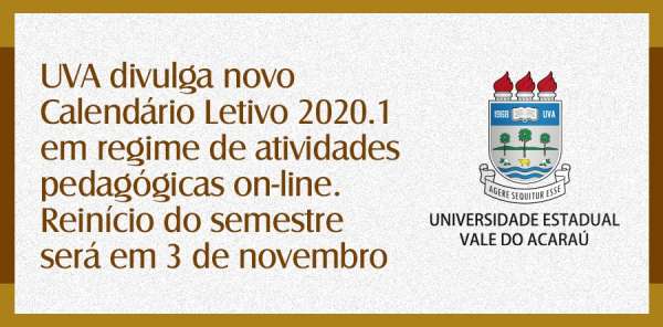 A Pró-Reitoria de Ensino de Graduação da Universidade Estadual Vale do Acaraú (PROGRAD/UVA) divulgou na terça-feira, 20 de outubro de 2020, o novo Calendário Letivo para o Semestre 2020.1, interrompido em decorrência da pandemia do novo coronavírus (COVID-19), em março desse ano. A retomada será em regime de atividades pedagógicas on-line, a partir do dia 3 de novembro próximo. O calendário foi aprovado pelo Conselho de Ensino, Pesquisa e Extensão da UVA (CEPE), por meio de videoconferência, em sessão realizada em 16 de outubro de 2020, conforme a Resolução nº03/2020-CEPE.