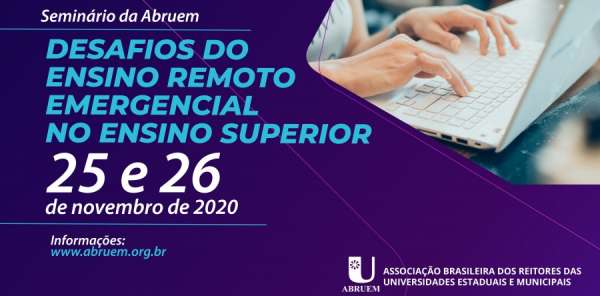 A Associação Brasileira dos Reitores das Universidades Estaduais e Municipais (ABRUEM), entidade à qual a Universidade Estadual Vale do Acaraú (UVA) é filiada, realizará, nos dias 25 e 26 de novembro de 2020, Seminário sobre os “desafios do ensino remoto emergencial na Educação Superior”. O evento, totalmente on-line, terá transmissão feita pela Universidade de Pernambuco (UPE). O evento terá início a partir das 9h, com acesso em www.abruem.org.br e não será necessário fazer inscrição.