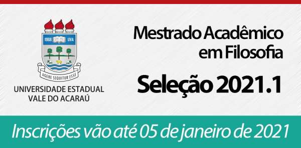 A Coordenadoria do Mestrado Acadêmico em Filosofia da Universidade Estadual Vale do Acaraú (MAF/UVA) iniciou o processo seletivo de candidatos à terceira turma do curso, com inscrições até o dia 5 de janeiro de 2021. De acordo com o Edital nº08/2020, publicado em 26 de novembro de 2020, são ofertadas 27 (vinte e sete) vagas para ampla concorrência, distribuídas em duas linhas de pesquisa, cada uma com seis vagas: 1) Filosofia da Religião e Filosofia Política; e 2) Ontologia, Conhecimento e Linguagem.