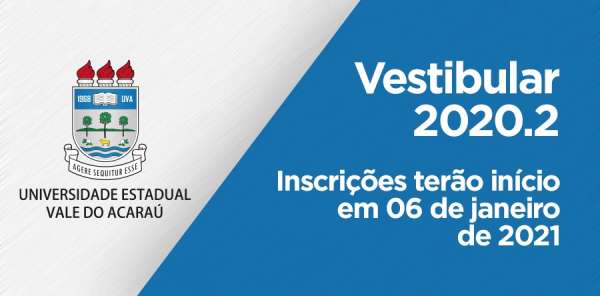 A Universidade Estadual Vale do Acaraú (UVA) publicou nesta quarta-feira, 10 de dezembro de 2020, o Edital nº04/2020 que rege o Processo Seletivo Vestibular 2020.2 para o preenchimento de 674 vagas, em 19 cursos de Graduação, ofertados em Sobral. O período de inscrições será de 06 a 29 de janeiro de 2021, devendo ser feitas, exclusivamente, via Internet, no endereço eletrônico vestibular.uvanet.br.
