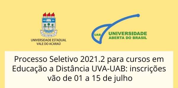 Estarão abertas, no período de 01 a 15 de julho de 2021, as inscrições de candidatos ao Processo Seletivo 2021.2 para ingresso em cursos de graduação a distância da Universidade Estadual Vale do Acaraú (UVA) a serem ministrados em convênio com o Programa Sistema Universidade Aberta do Brasil (UAB/CAPES/MEC). São ofertadas 500 (quinhentas) vagas nos cursos de graduação em Administração Pública, Educação Física e Pedagogia.