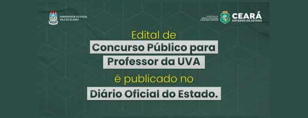 Foi publicado no Diário Oficial do Estado do Ceará (DOE) desta segunda-feira, 25 de março de 2022, o EDITAL nº 09/2022 (pág. 12) que dispõe sobre a realização do Concurso Público de Provas e Títulos para provimento de Cargo de Professor Efetivo das classes Auxiliar, Assistente e Adjunto da Universidade Estadual Vale do Acaraú (UVA). As normas do Edital foram aprovadas pela Resolução ad referendum Nº 12/2022, do Conselho de Ensino, Pesquisa e Extensão (CEPE), de 19 de abril de 2022.