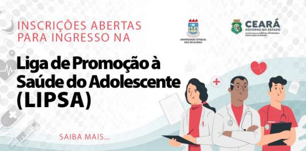 Estão abertas as inscrições para ingresso na Liga de Promoção à Saúde do Adolescente (LIPSA), na modalidade integrante voluntário. Vinculada à Pró-Reitoria de Extensão e Cultura (PROEX) da Universidade Estadual Vale do Acaraú (UVA), a Liga é formada por alunos, com a tutoria de docentes do Centro de Ciências da Saúde (CCS/UVA). As inscrições podem ser feitas até o dia 9 de maio 2022, de forma on-line, mediante o envio de e-mail para lipsa_uva@uvanet.br, conforme orientações disponíveis no EDITAL No 10/2022 – PROEX.