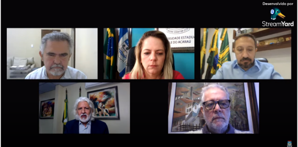 Com transmissão pelo canal da Universidade Estadual Vale do Acaraú (UVA) no Youtube, o encontro contou com a participação do secretário de Ciência e Tecnologia e Educação Superior, Carlos Décimo, do diretor Científico da Funcap, Luiz Drude de Lacerda, da reitora da UVA, professora Izabelle Mont’Alverne, do vice-reitor, professor Francisco de Carvalho, e do reitor da Universidade Regional do Cariri, professor Lima Júnior.