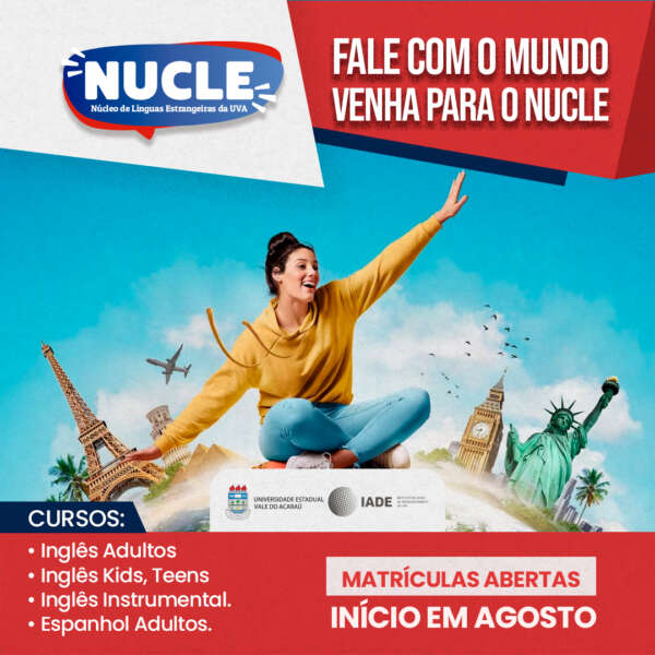 O Núcleo de Línguas Estrangeiras da Universidade Estadual Vale do Acaraú – NUCLE/UVA está com matrículas abertas para novas turmas no curso de Inglês, nas modalidades Kids, Teens, Adultos e Instrumental, e no curso de Espanhol para o público Adulto. As matrículas podem ser realizadas até o dia 11 de agosto, presencialmente no Bloco do curso de Administração, em frente à praça da Integração, no campus Betânia.