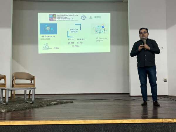 O pró-reitor de Pesquisa e Pós-graduação da UVA, professor Antônio Glaudenir Brasil Maia, abriu os trabalhos do Encontro, que trouxe como primeiro palestrante o biólogo egresso da UVA, divulgador científico e professor Paulo de Aragão, que proferiu palestra com o tema “A Universidade e a sociedade: construindo pontes através da comunicação científica”.