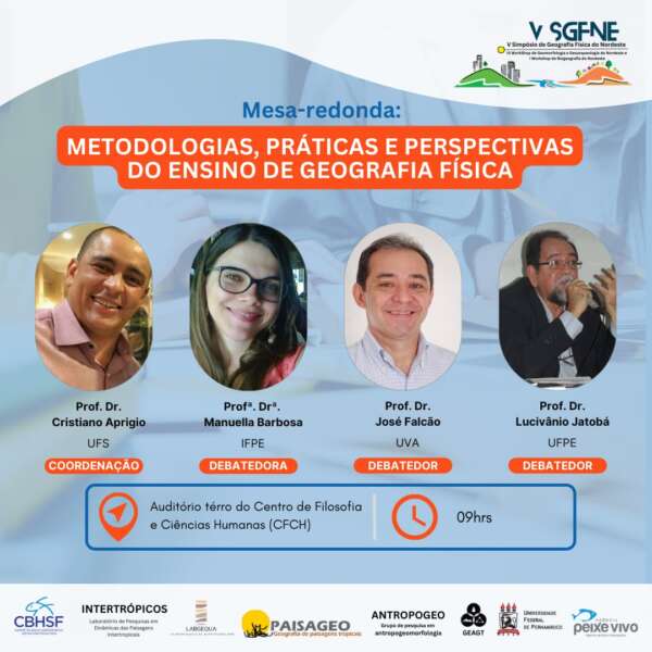 O professor José Falcão é um dos conferencistas do V Simpósio de Geografia Física do Nordeste, participante da mesa redonda com o tema “Metodologias no Ensino em Geografia Física”. Em sua fala, o docente explanou sobre a realidade dos alunos do Mestrado na vivência em sala de aula, bem como sua experiência nas Feiras de Ciências por ele organizadas e apoiadas pelo CNPq. Nesta edição o Simpósio, sediado pela Universidade Federal do Pernambuco (UFPE), tem como tema “Mudanças Ambientais e as Transformações da paisagem no Nordeste Brasileiro”.