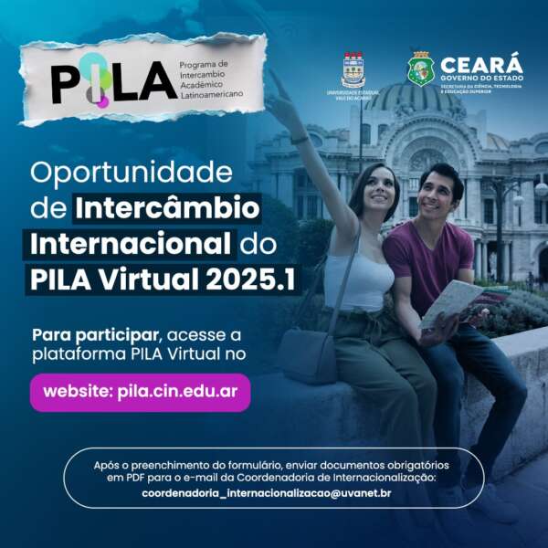 A Pró-Reitoria de Pesquisa e Pós-Graduação (PRPPG) da Universidade Estadual Vale do Acaraú (UVA), por meio da sua Coordenadoria de Internacionalização, torna público a chamada para estudantes da UVA e estabelece as normas e requisitos para concorrer a vagas no Programa de Intercâmbio Acadêmico Latino-americano (PILA) na modalidade virtual 2025.1. O objetivo do Programa é promover a internacionalização do ensino superior e fortalecer os laços de cooperação entre as IES latino-americanas e caribenhas.