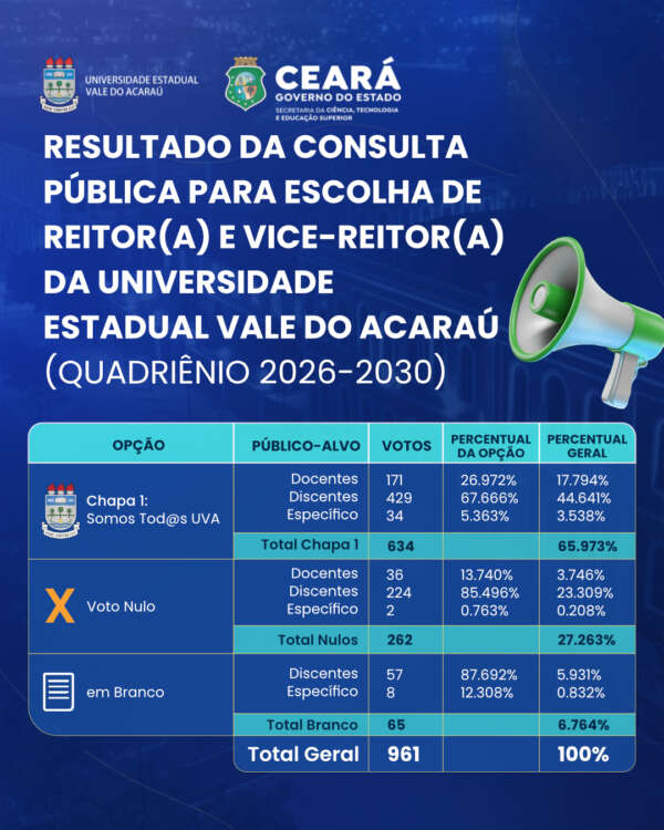 A Universidade Estadual Vale do Acaraú (UVA), por meio da Comissão Eleitoral, torna pública o resultado da consulta pública realizada no dia 03 de dezembro de 2025, com a comunidade acadêmica (docentes, servidores técnico-administrativos e discentes). A Consulta tem como objetivo orientar a eleição a ser realizada pelo Colégio Eleitoral Especial, constituído pelos membros do Conselho Universitário (CONSUNI), Conselho de Ensino, Pesquisa e Extensão (CEPE) e Conselho Diretor (CONDIR), no dia 17 de dezembro de 2025, visando a eleição aos cargos de Reitor (a) e Vice-Reitor (a) para o período de 02/04/2026 a 01/04/2030, e que teve inscrita a seguinte chapa: