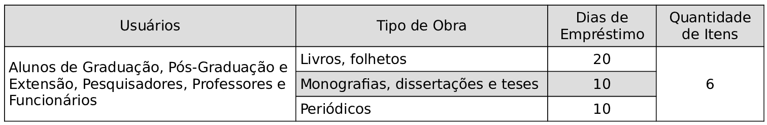 Tipos, quantidade e prazos de empréstimo de material, de acordo com as categorias de usuário: