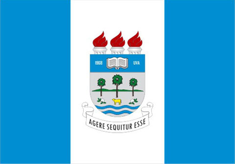 A bandeira está dividida em três retângulos verticais em azul e branco. O retângulo central, de branco e mais largo, serve de campo para o Brasão da UVA. Terá como suporte cordão e borlas de prata e azul com haste e lança de ouro.